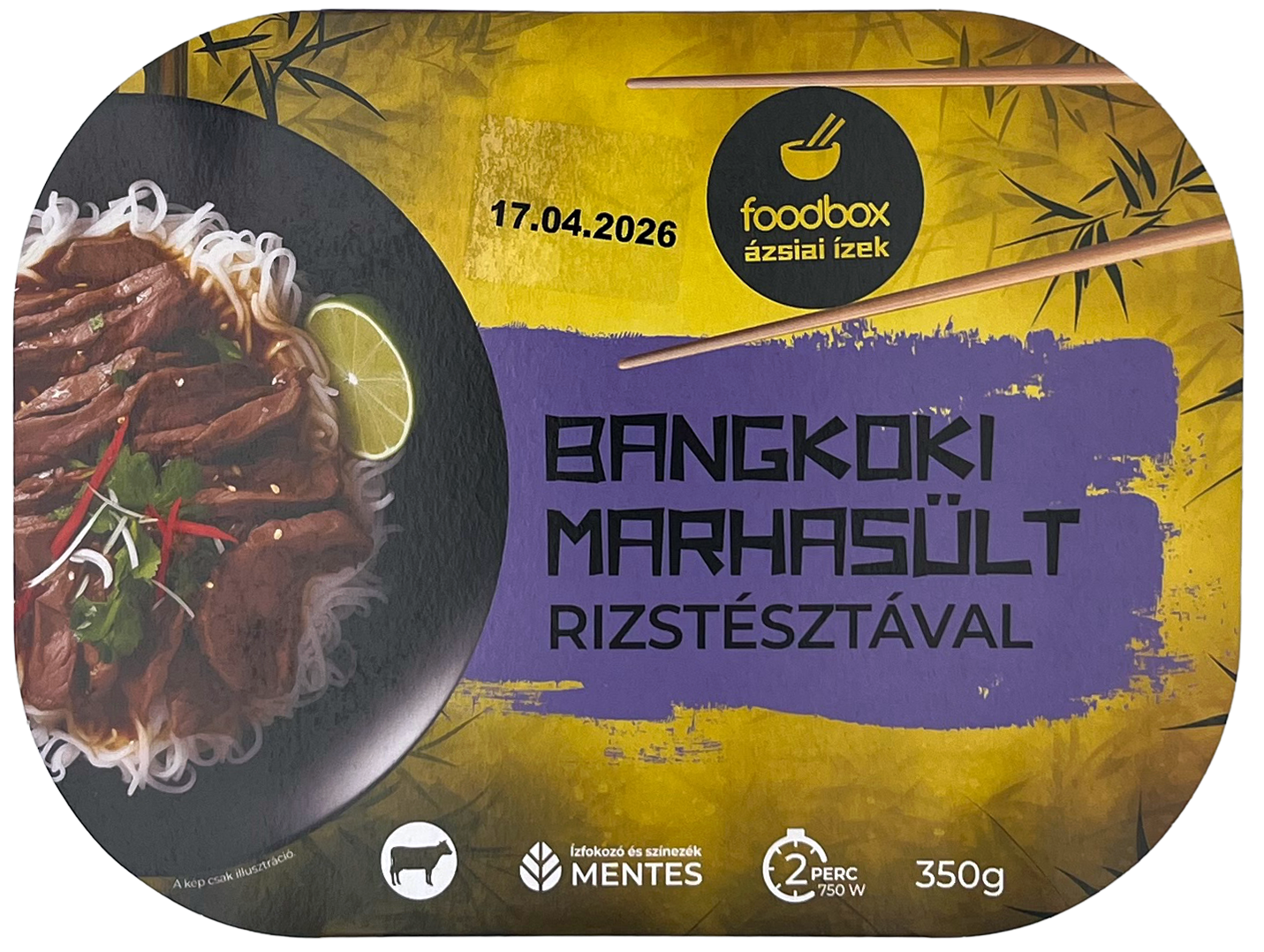ÖSSZETEVŐK (az allergén összetevők vastag betűvel feltüntetve): ivóvíz, 20% rizstészta (rizsliszt 90%, ivóvíz), 17% kockázott marhacomb, 6,8% kínai kel, fejeskáposzta, paradicsompüré, napraforgó-étolaj, vöröshagyma, szójaszósz (ivóvíz, szójabab, cukor, étkezési só, búzaliszt (glutén), tartósítószer (kálium-szorbát)), cukor, kukorica, keményítő, fokhagyma. A termék tejet, tojást, mustárt és zellert tartalmazhat.